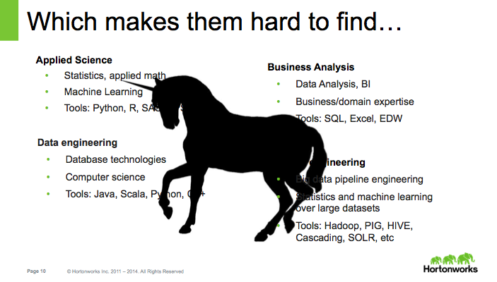 Apparently this skill set is so rare that the Hortonworks team recommend their customers recruit data science teams, rather than hunting this mythical Unicorn. From their presentation …