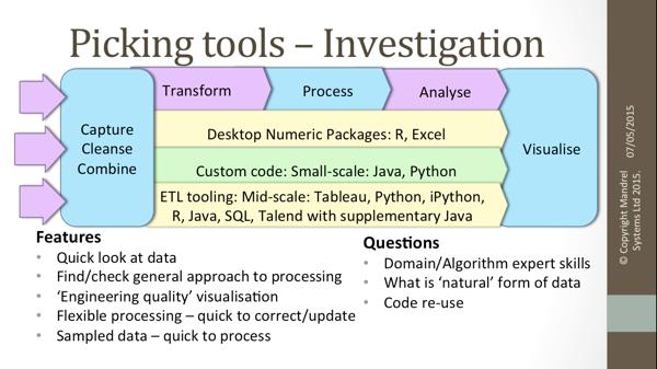 Where is the area of difficulty? ‘Traditional’ tools such as Excel may be quite adequate for a quick look at a sample of data, or familiar tools such as R may allow domain experts to model data and devise processing algorithms more quickly.