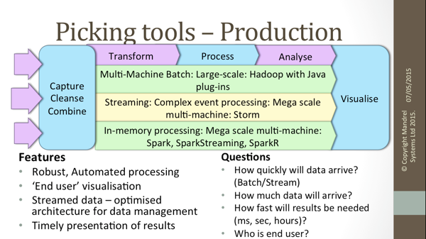 While giving an overview of the tooling available, I presented questions that should be considered in selecting tools for Big Data projects: